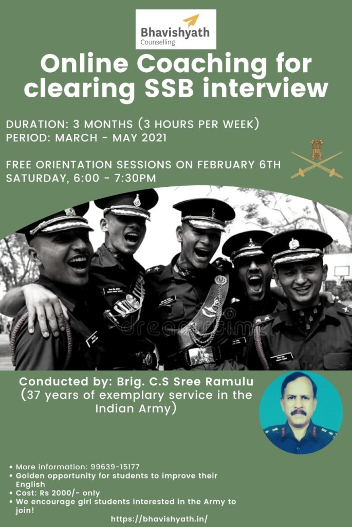 The Covid 19 pandemic has affected people from every walk of life. It posed a major threat to the public health system, livelihoods, employment, and as a whole impacted the country’s economy. Education is one such critical aspect which had borne the brunt as schools have been shut down and students and teachers are no longer in the classroom. In this crucial phase, students are to be hand-held, guided in a proper way, and motivated in order to ensure continuity in learning. In this context, career guidance plays a vital role in enabling the students to take informed life decisions. I had personally observed how our course on the army took off with candidates exhibiting noticeable incremental knowledge and behaviour outcome as the sessions progressed. By taking stock of the aspirants’ interest, now we are planning for a 3-month intensive course starting this March 2021. I did not cover the actual technicalities and nuances of SSB interview through this piece since it is for a general audience. For those actually interested in joining the Armed Forces, I invite you to join us in one of our pre-course orientation sessions for more detailed information.